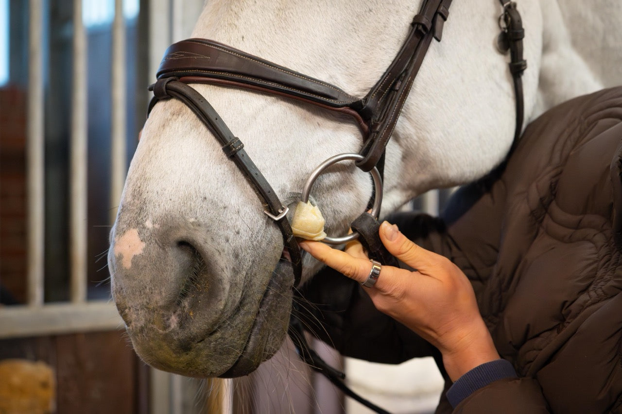 Die Anwendung der MTEX Latexbandage ist unkompliziert und effektiv: Schneide das Band einfach auf die gewünschte Länge zu, entferne die Schutzfolie, und wickle es fest um das Gebiss. Die leichte Überlappung sorgt für einen sicheren Halt und einen sanften Polstereffekt, der das Gebiss weicher macht und vor Scheuerstellen schützt.